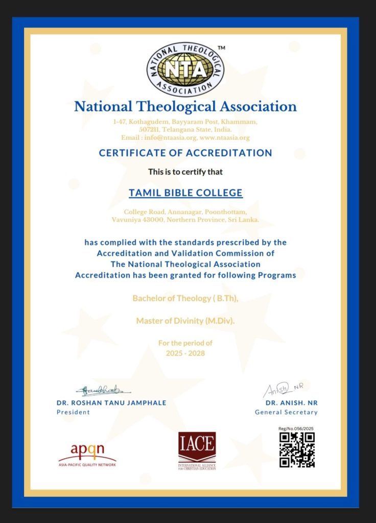 பரிசுத்த வேதாகமத்தை நேசிக்கும் யாவரும் எங்கள் வேதாகம கல்லூரியில் இனைந்து இவைகளை கற்றுக்கொள்ளலாம்.கர்த்தர் சித்தமானால் ஜீவனோடு இருந்தால் எதிர்காலங்களில் (M.Th.) இறையியல் முதுநிலைப் பட்டப் படிப்பும் வழங்கிட முயற்சிகள் எடுக்கப்படும் என்பதனை இத்தால் மகிழ்ச்சியுடன் அறியத்தருகிறேன்.